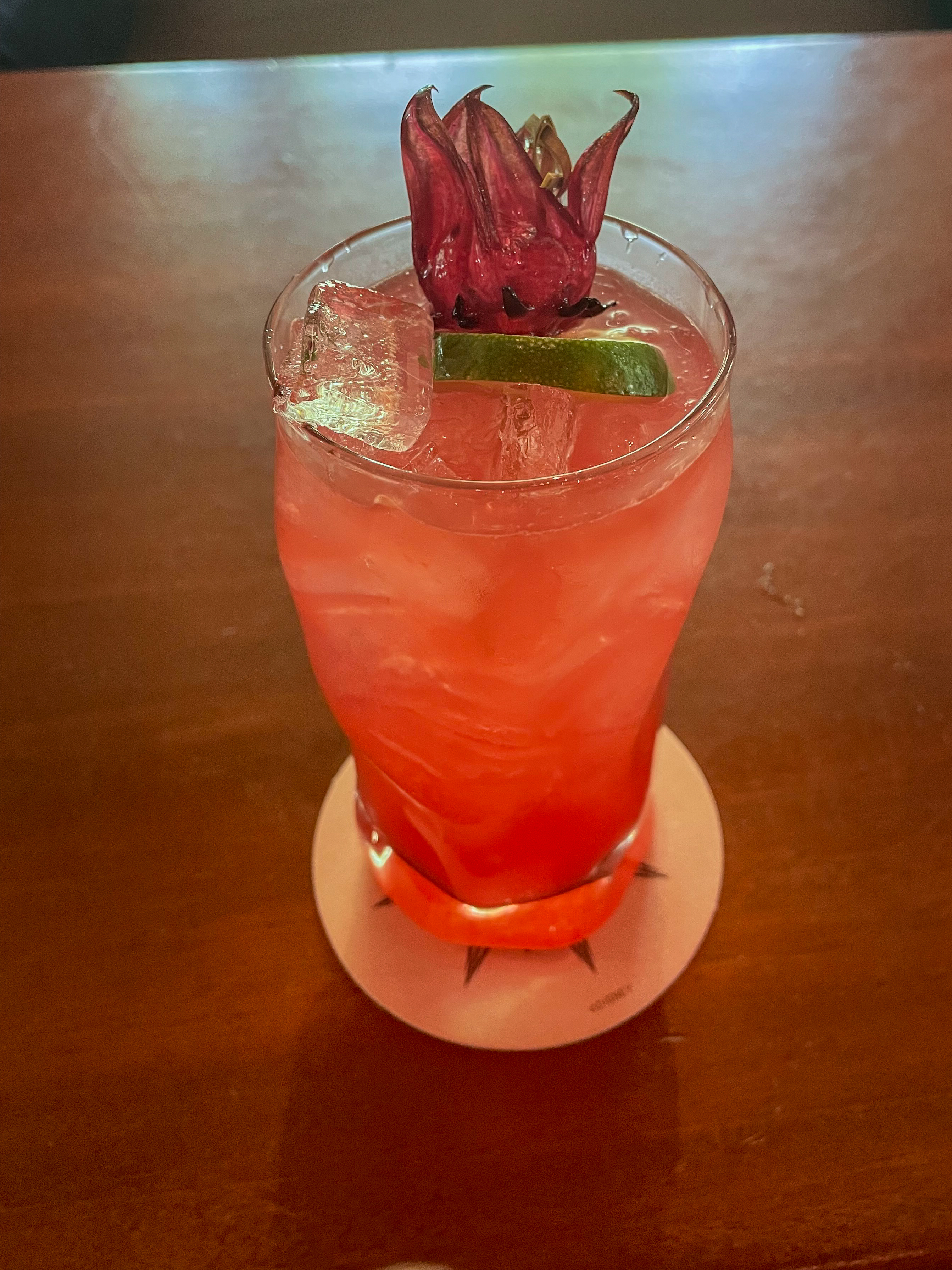 Sights: The super cool candied hibiscus flower provides drama and flair…Otherwise it’s just kinda pinkish with a lime wheel.